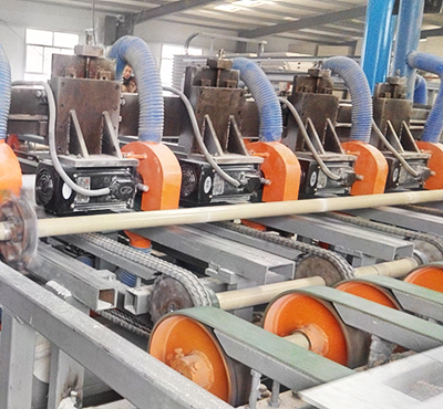 5.刮膩?zhàn)颖衬z系統(tǒng):此系統(tǒng)由膩?zhàn)优淞蠙C(jī),刮膩?zhàn)颖衬z機(jī)及一號(hào)烘干機(jī)組成。板材經(jīng)過該系統(tǒng),表面更加光滑均勻,背面得到膠水保護(hù)。